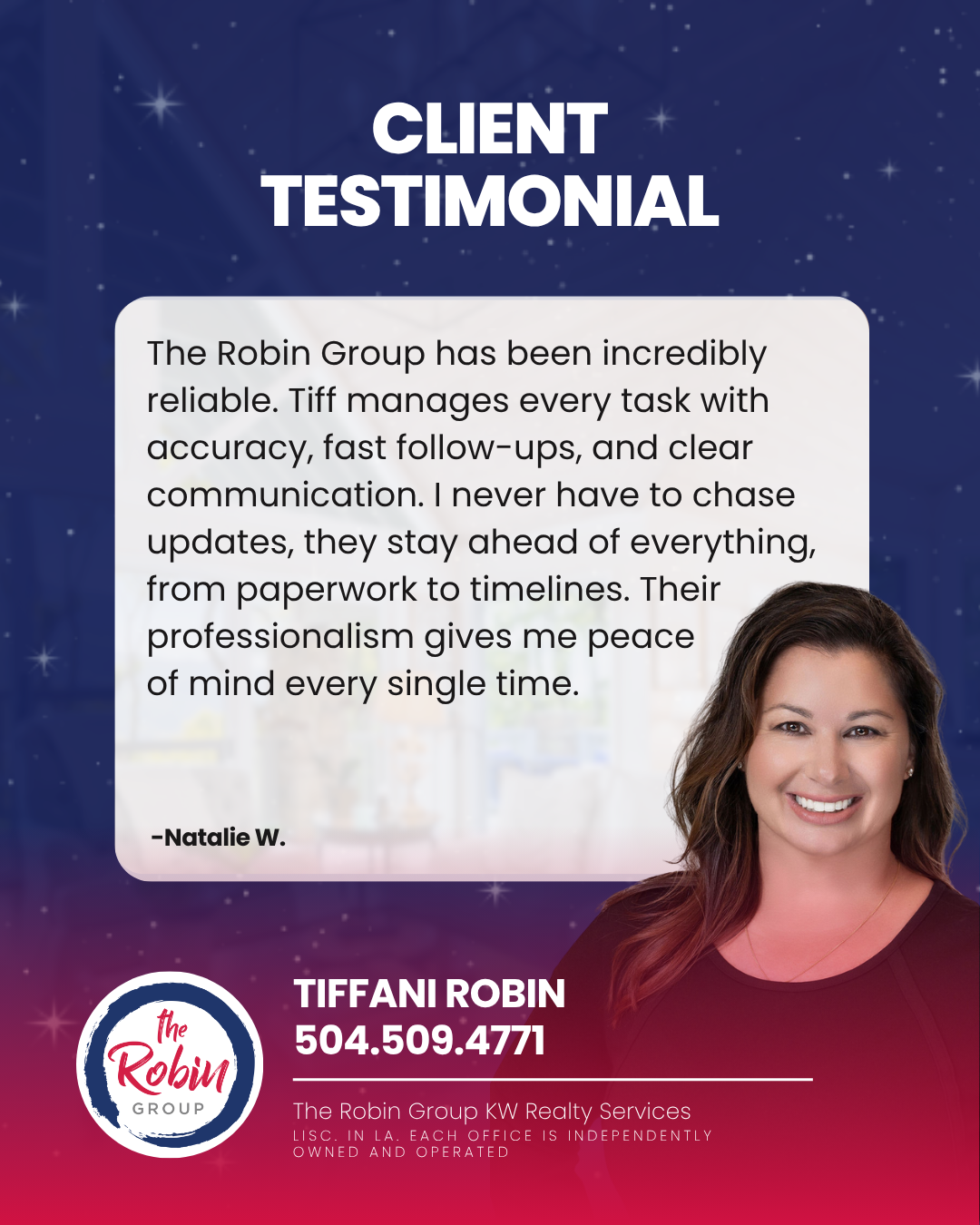 When it comes to buying or selling a home in Louisiana, choosing the right real estate team can make all the difference. At The Robin Group of KW Realty Services, our mission is to deliver exceptional service, expert guidance, and results that move you forward with confidence. But don’t just take our word for it—our client testimonials speak volumes about the experience we provide.