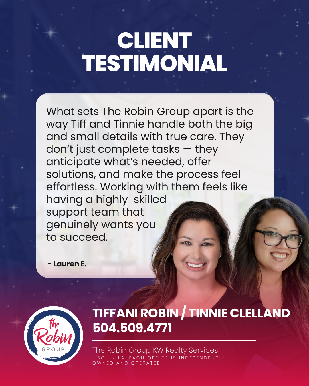 Your story could be the next glowing testimonial! Whether you’re ready to buy your first home, sell your current property, or explore investment opportunities in Louisiana real estate, The Robin Group is here to help.